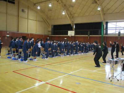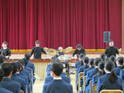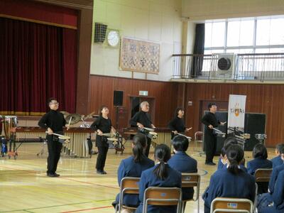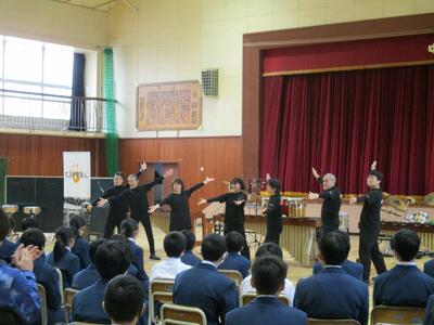 マリンバやドラムセットをはじめ、演奏団体がオリジナルで作成した打楽器など、多種多様な打楽器の演奏に魅了される時間となりました。また、1年生の生徒全員でボディーパーカッションにチャレンジし、会場が音楽の一体感に包まれていました。